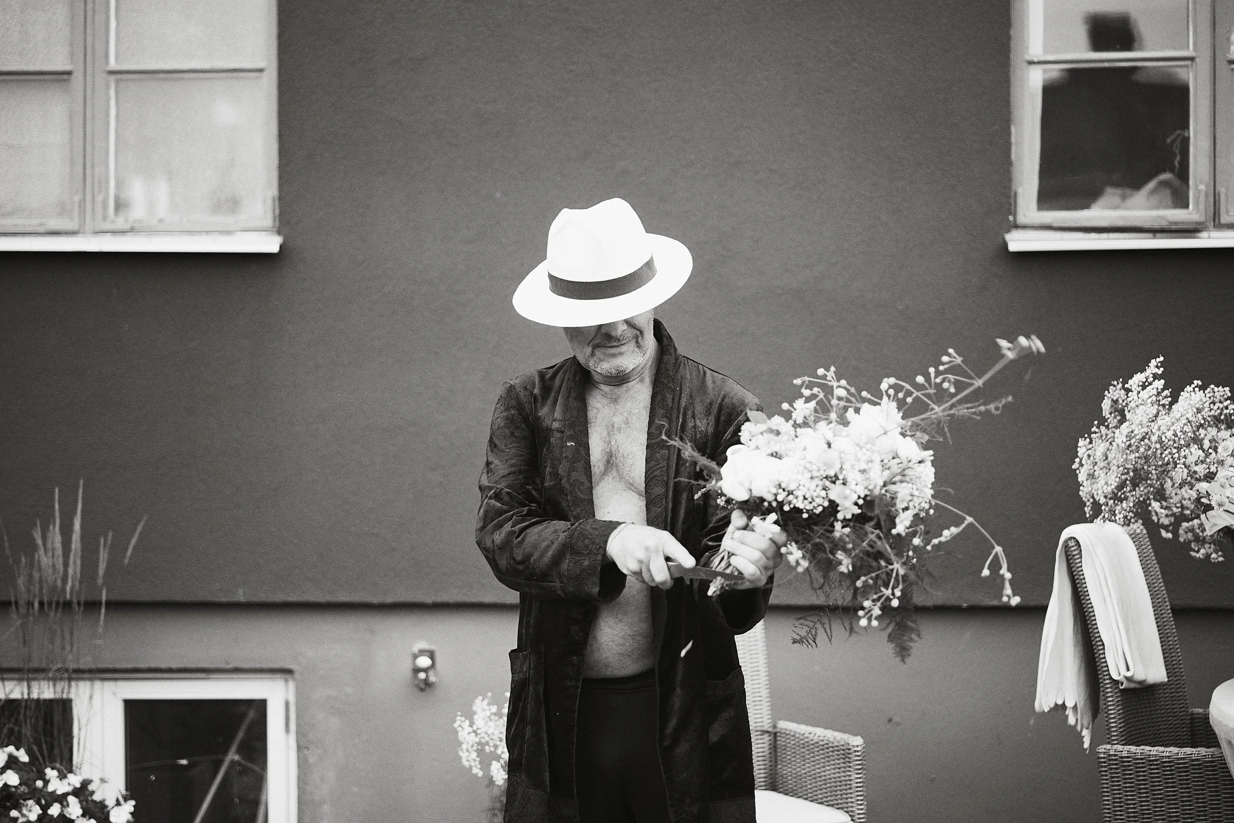 Brudgummens far, Thomas, binder brudbuketten i sin trädgård där bruden växt upp. Där dom haft fester och upplevelser men nu flyttat ut. Med koppling utan uppklätt snarare än “fin” backdrop och uppklätt. Platsen är laddad med något meningsfullt.